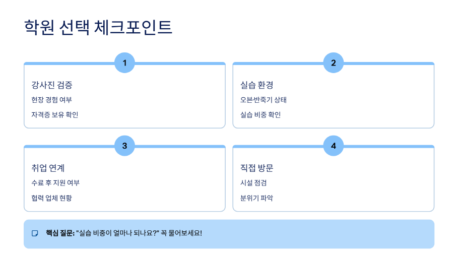 무조건 상담이에요. 커리큘럼, 실습 비중, 수료 후 진로까지 직접 물어봐야 감이 와요. 가능하다면 학원 방문해서 실습실 한 번 보는 것도 정말 도움 됩니다.