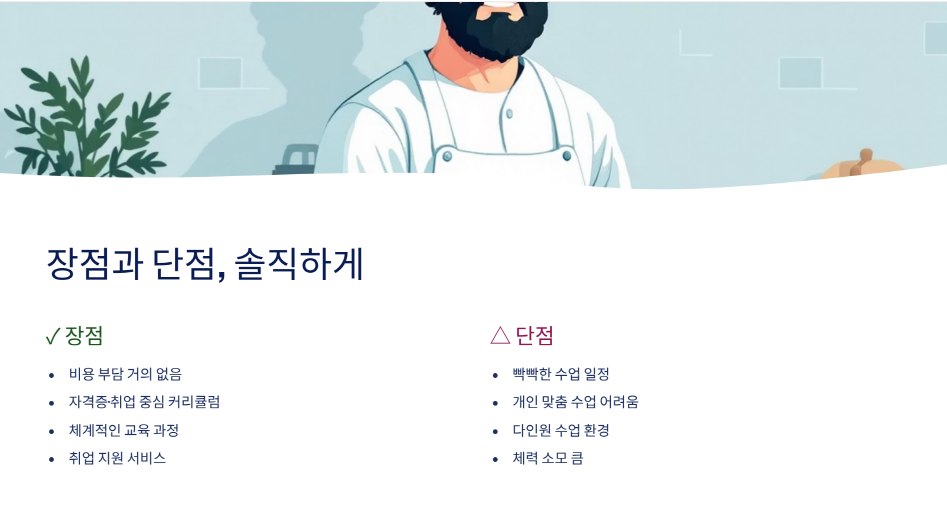 장점부터 말하면 역시 비용 부담이 거의 없다는 점이 가장 커요. 그리고 커리큘럼이 자격증, 취업 위주로 짜여 있어서 방향성이 분명하다는 것도 좋았고요. 반대로 단점은 수업 일정이 빡빡하고, 개인 맞춤 수업은 기대하기 어렵다는 점이에요. 한 반에 여러 명이 함께 움직이다 보니 어쩔 수 없는 부분이 있더라구요.