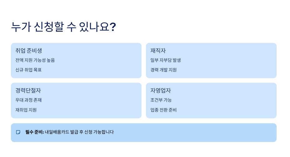 가장 많이 물어보는 게 바로 “나도 들을 수 있나요?” 이거예요. 결론부터 말하면, 생각보다 조건이 까다롭지 않아요. 직장인, 취준생, 경력단절자, 자영업자까지도 가능한 경우가 많거든요.