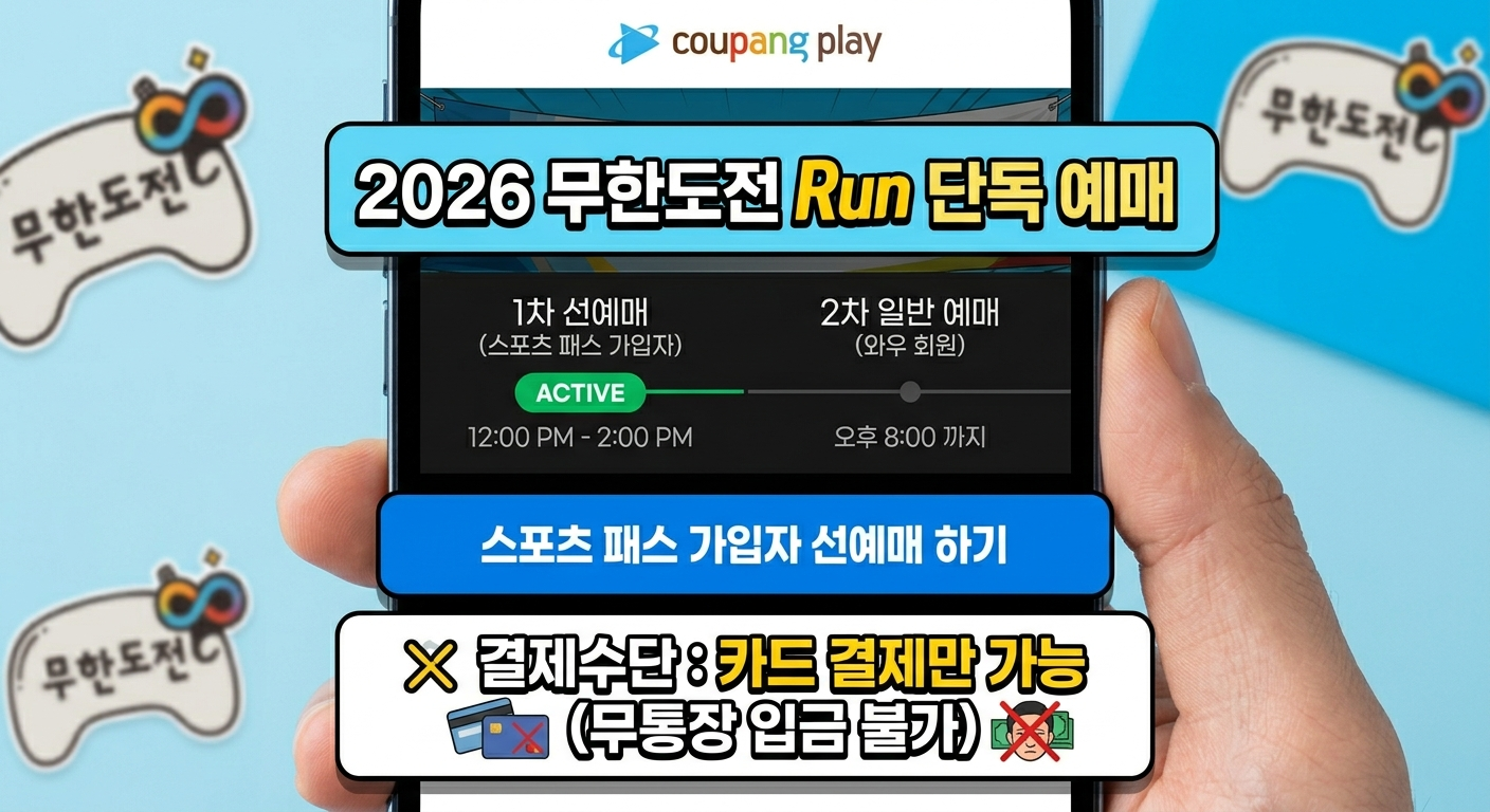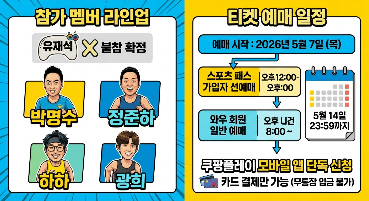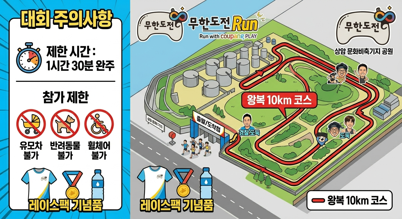 2026 무한도전 Run은 과거의 추억과 건강을 동시에 챙길 수 있는 특별한 이벤트입니다. 쿠팡플레이 앱을 통한 단독 예매로 진행되는 만큼, 스포츠 패스 가입 여부와 예매 시간을 미리 확인하여 차질 없이 준비하시기 바랍니다. 참가자 전원에게는 레이스팩 등 기념품이 제공될 예정입니다.